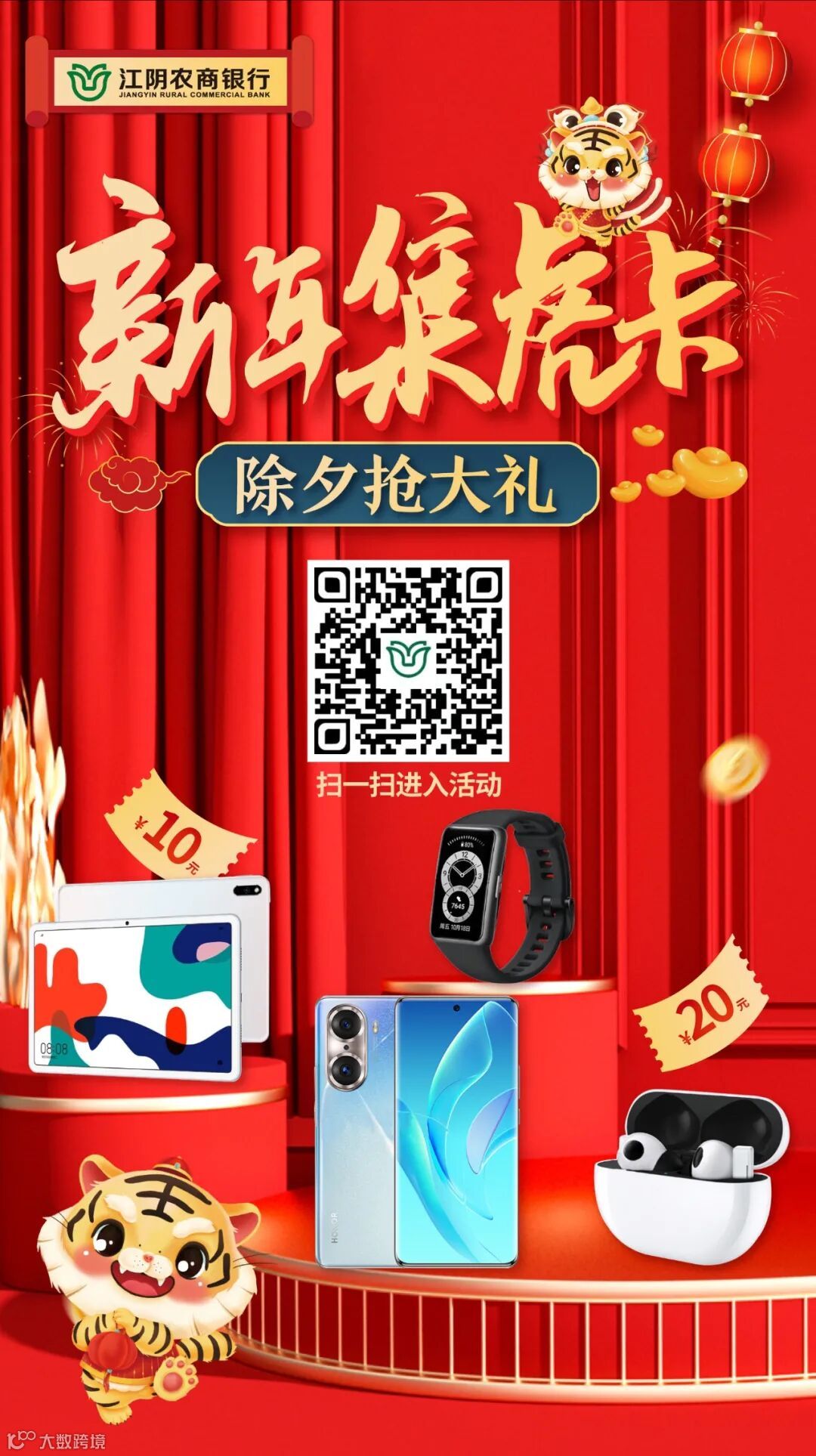 用户默认3次抽卡机会,通过微信等渠道进行分享,分享一次多得一次抽卡机会,集齐3虎即可获得福虎卡(未激活状态),客户在2022年1月28日前在我行新增资产1万以上的,即可激活福虎卡,获得除夕开奖资格,一起开箱荣耀手机60pro、华为matepad、freebudsPro耳机、华为手环、饮品畅饮券等豪华奖池!
