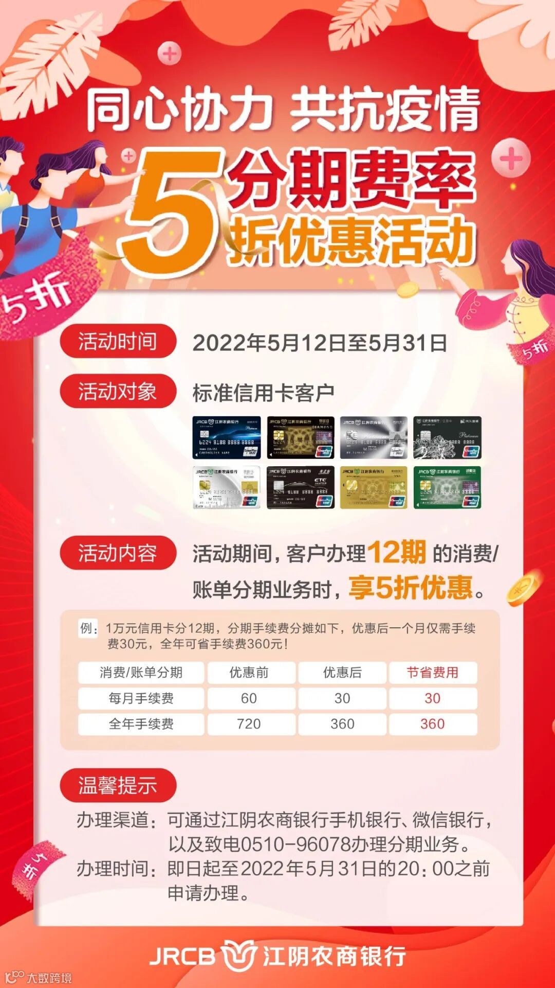 4.参与本活动的客户须遵守本行信用卡各项分期付款业务条款的相关规定,详询客服热线0510-96078。