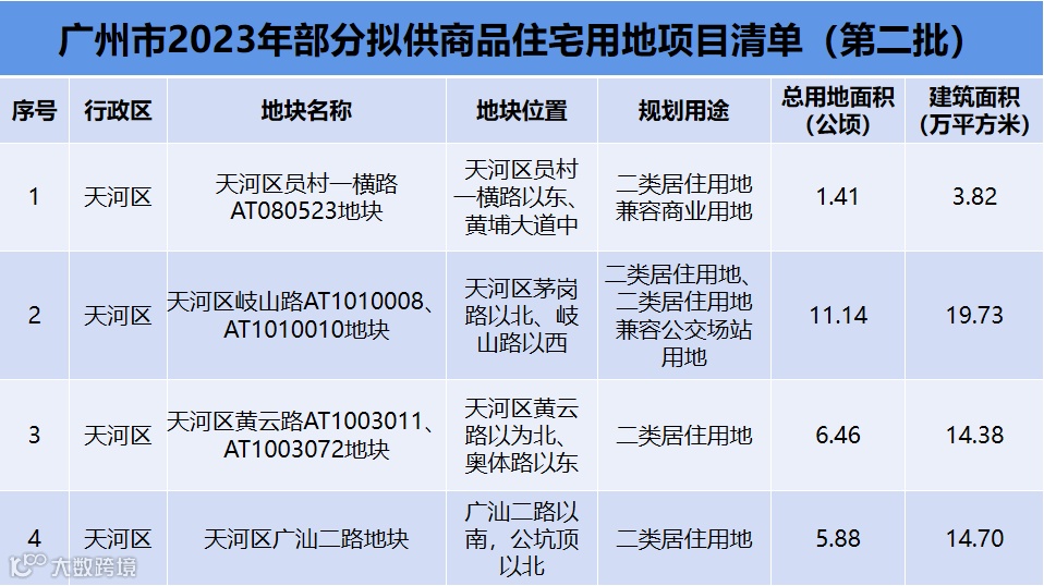 5月6日,广州2023年第二批次拟供应地块发布,总共18宗地块,其中天河占4宗,本次将采用挂牌方式出让,拟于5月11日至8月10日期间正式挂牌官宣。