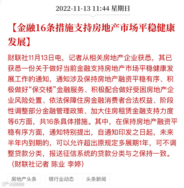 而这“16条”内容涉及保持房地产融资平稳有序、积极做好“保交楼”金融服务、积极配合做好受困房地产企业风险处置、依法保障住房金融消费者合法权益、阶段性调整部分金融管理政策、加大住房租赁金融支持力度六大方面共十六条具体措施。