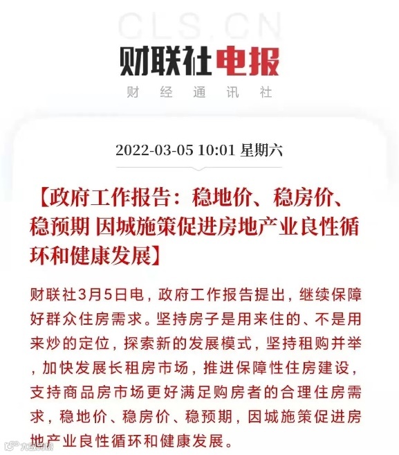 3月5日,在全国人大会议上,2022年政府工作报告对楼市作了最新定调:楼市调控放松,支持合理住房需求。