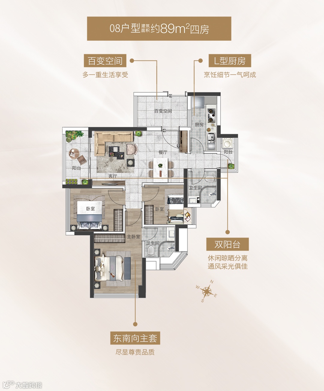 建面约89㎡幸福四房,双阳台设计,朝夕之间,阳光满屋,清新通风。L型厨房,美味加速传递。百变空间巧妙设计,生活享受不重样,三代同堂也能拥有充足的空间享受。动静分区,相隔一方,各有所乐。