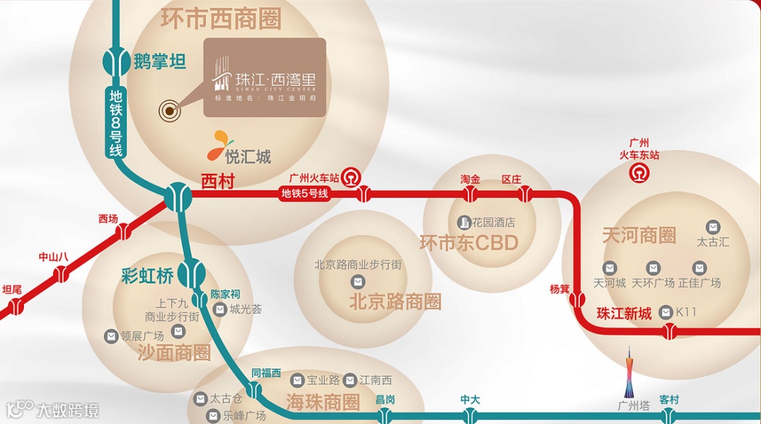 1站西村站(在建中)换乘5号线,2站到越秀,9站到珠江新城,连接荔湾区、越秀区、天河区和黄埔区四大中心区域。