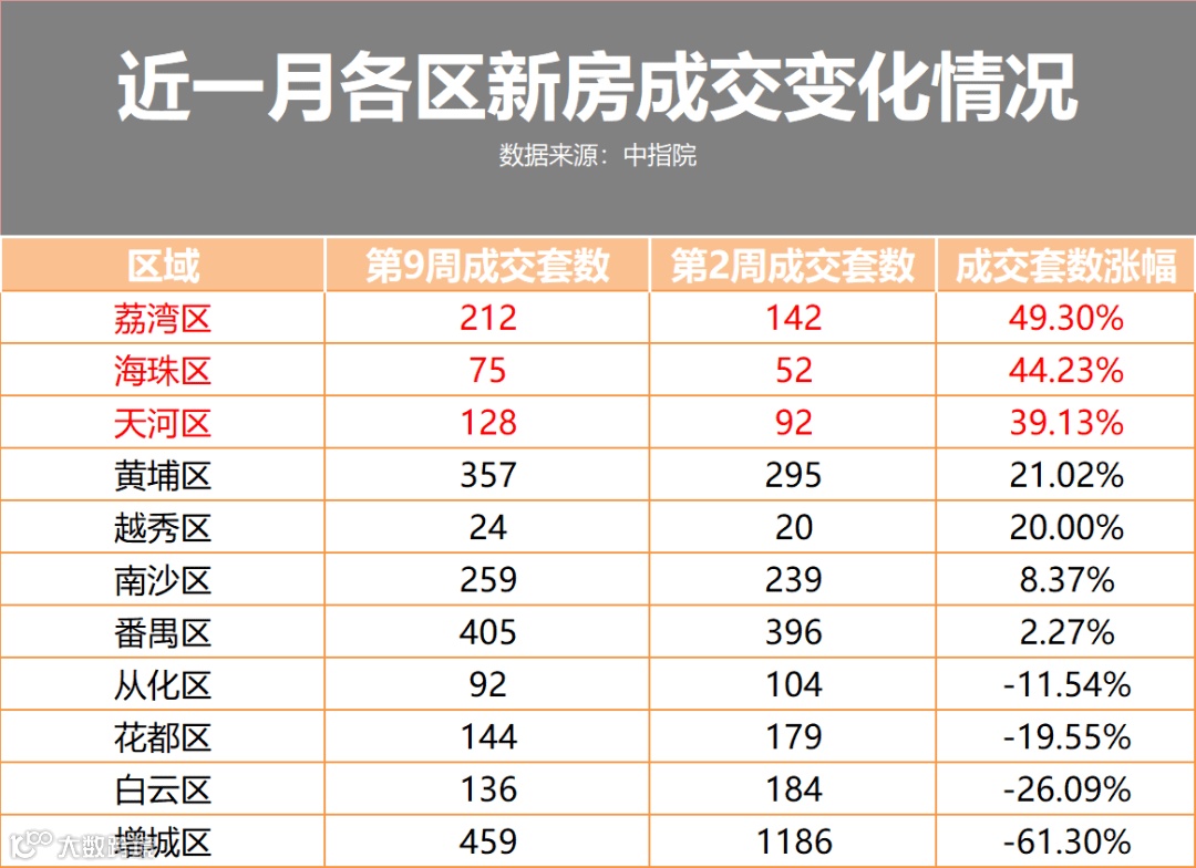 在2月末,广州便对房贷利率进行了下调,楼市出现较为明显的回暖迹象。而购买力强的中心区最先反应,由中指院数据可见,荔湾区近一月新房成交套数遥遥领先,可见已有不少购房者闻风而动,抢占置业中心区的先机。