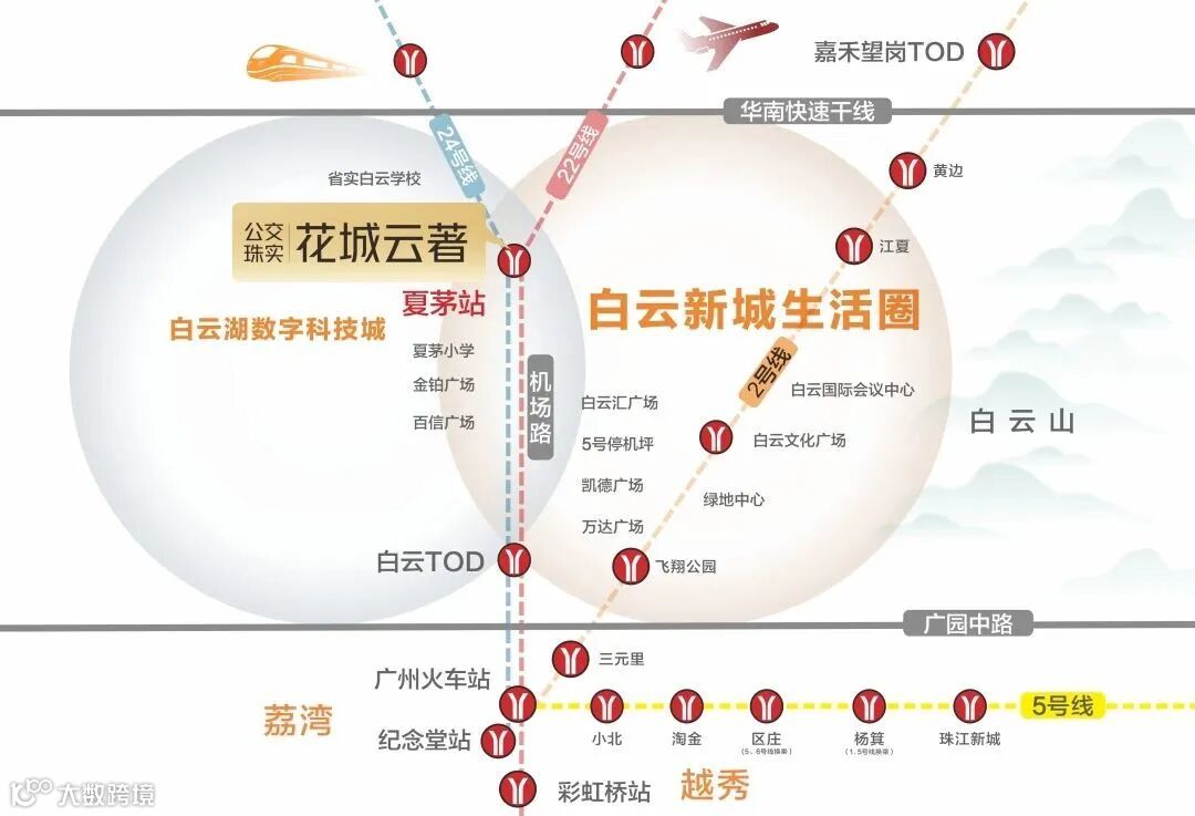 经22号线(建设中)1站白云新城旁、3站荔湾彩虹桥