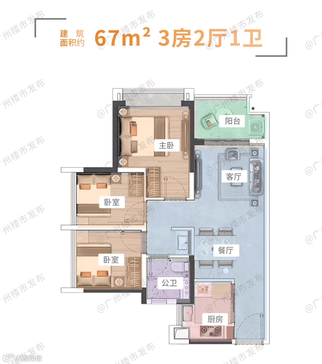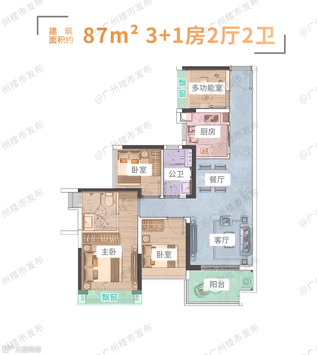 广钢花城首推的67㎡户型2+1设计格局,采用经典竖厅结构,同时做到了全屋全明、动静分区的空间格局;厅出阳台的设计,更保证了房间的采光和通风。而87㎡户型能做到3+1房两厅两卫,一步到位,并且主卧升级成套间设计,让业主生活隐私性更高。