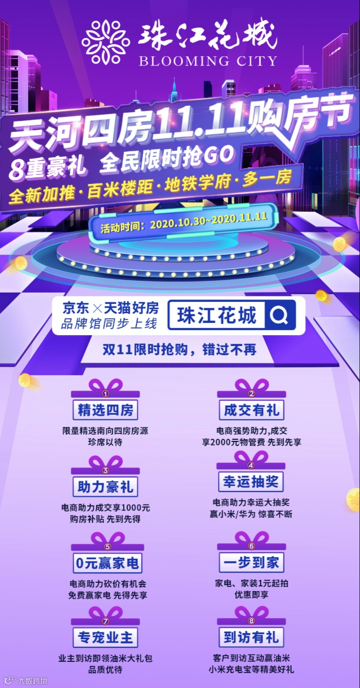 据了解,经历了国庆档期新品热销,天河大盘珠江花城将从10月30日起顺势推出“天河四房11.11购房节”活动。