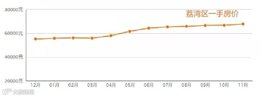 此前广州二手房指导价所列名单里,没有荔湾!而纵观过去一年的表现,荔湾区一手楼价不仅不受其乱,反而稳中有升。11月刚冒头,新房均价 67906 元/㎡,已环比上月涨了1.59%。