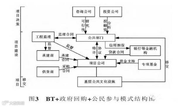 1.BT+政府回购+公民参与。这种模式主要针对新建基层公共文化设施。政府首先要对项目建设进行可行性研究,通过城市规划部门调查规划同时征求民意。然后颁布政府采购意向,招标项目总承包商并签订采购合同,由总承包商负责文化设施的设计、建设。建设期内总承包商负责项目的融资,基层公共文化设施建成完工后,政府负责质量验收并通过分期付款回购设施,政府负责基层公共文化设施建成后的运营管理工作。这种模式的优点:一是采用政府回购,私人部门设计建设,增加了建设效率,缩短建设周期;二是引入公民参与,降低了基础文化设施布局不合理问题的发生,提高使用率。缺点:文献表明,多数PPP项目失败的主要原因,是政府对私营部门进行过多干预,因此,如何进行适度监管防止合作失败,是公共部门面临的主要问题。