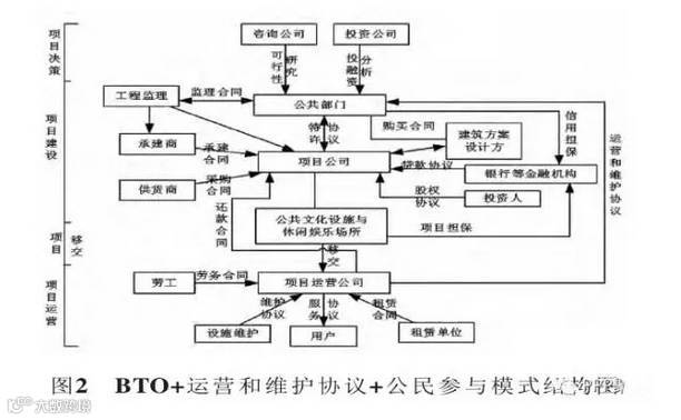 2.BTO+运营和维护协议+公民参与。与上述模式的不同之处在于,公共部门将公共文化设施的建设与运营分别委托给两个私营部门,颁布特许意向,公开招标项目建设公司和项目运营公司。项目运营阶段的现金流作为偿还项目建设费用和留作运营公司利润。这种模式的优点:一是降低了招标单位的进入门槛,引入竞争机制,利于筛选;二是将建设与运营分开,有利于提高建设和管理效率。缺点:一是增加招标成本与招标时间;二是增加了委托代理中的道德风险。
