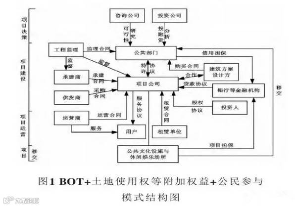 1.BOT+土地使用权等附加权益+公民参与。在这种模式中,项目发起人(一般为政府)首先需要委托咨询公司对项目进行初步可行性研究,然后起草文件,公开招标最佳设计方案。在招标环节鼓励民众参与,形成民众投票选择与专家评审相结合的评选机制,赋予双方权重选择得分最高的设计方案。颁布特许意向,招标项目合作公司(一般为具有一定资金实力的公司或财团),与项目合作公司签订特许协议,组建项目公司负责项目的建设运营。作为补偿,给予项目合作公司土地使用权,用于建设购物广场和美食广场等并给予一定期限的经营权,经营期内项目合作公司负责公共文化设施的管理运营,经营期满一并交予政府。这种模式的优点:一是BOT的起源较早,有较多的国外经验可以借鉴;二是BOT是开放本国建设和运营市场,吸收国外资金的模式,能够解决国内金融资本不足;三是大型公共文化设施对技术要求比较高,而在这种模式中项目由国外机构承担,能够为本国带来管理经验和先进技术等。缺点:这种模式对项目合作公司要求比较高,需要具备建设运营等多项业务储备。