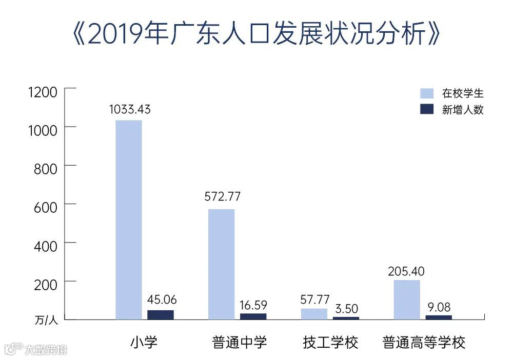 根据广东省统计局发布的《2019年广东人口发展状况分析》,2019年广东省常住人口数量继续居全国首位。全省小学在校生数量自2014年起持续递增,2019年全省小学在校学生达到1033.43万人,比上年同期增加45.06万人。