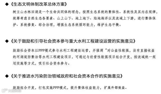 3、将公益性项目与经营性项目打包。在流域综合治理领域,将大坝等枢纽工程与水电站、供水站捆绑,将荒山水土保持与林权及旅游资源开发捆绑等,这种项目设置实现了政府和社会资本的共赢。