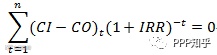 按《方法与参数》,财务内部收益率指标涉及三种指标:一是“项目投资财务内部收益率”指标,二是“资本金财务内部收益率”,三是“投资各方财务内部收益率”指标。这也是目前PPP项目中经常使用的三个指标。三个指标皆是以项目全周期净现金流为考察对象的动态指标,是指在项目计算期内各年净现金流量(现金流入-现金流出)现值累计值为零时的折现率。“财务内部收益率”一般都是通过编制现金流量表而计算获得,可用以下公式予以概括: