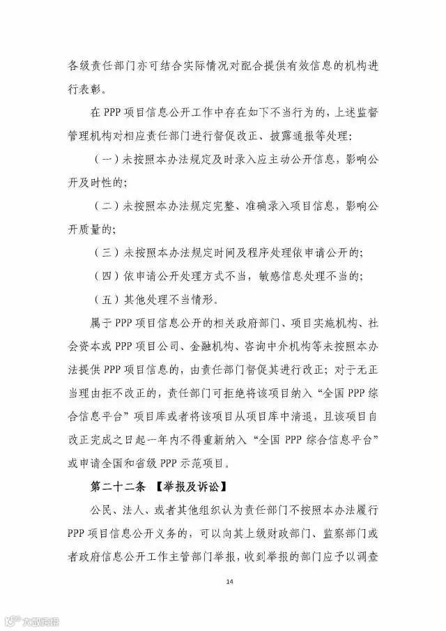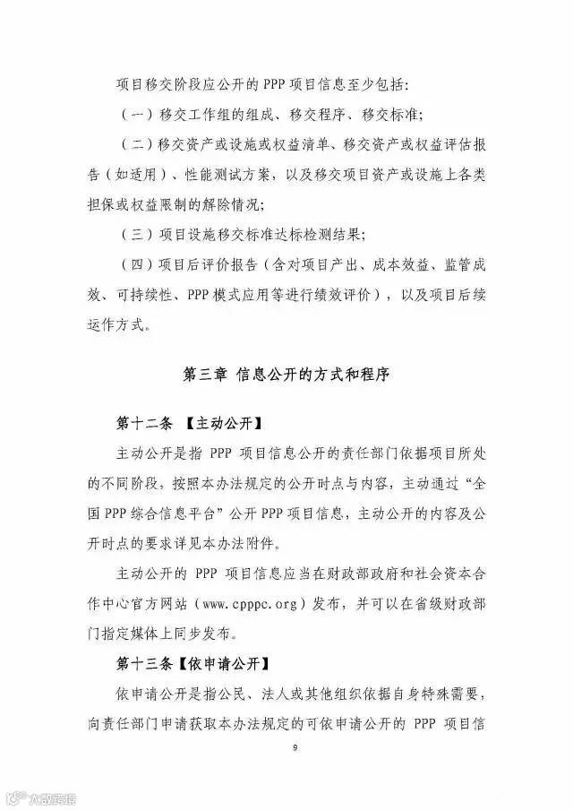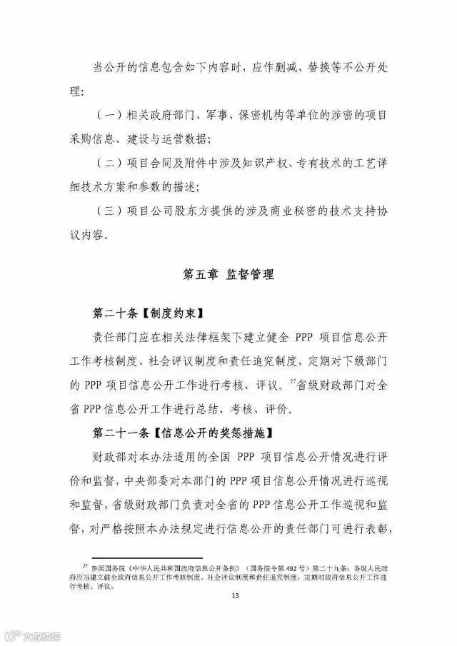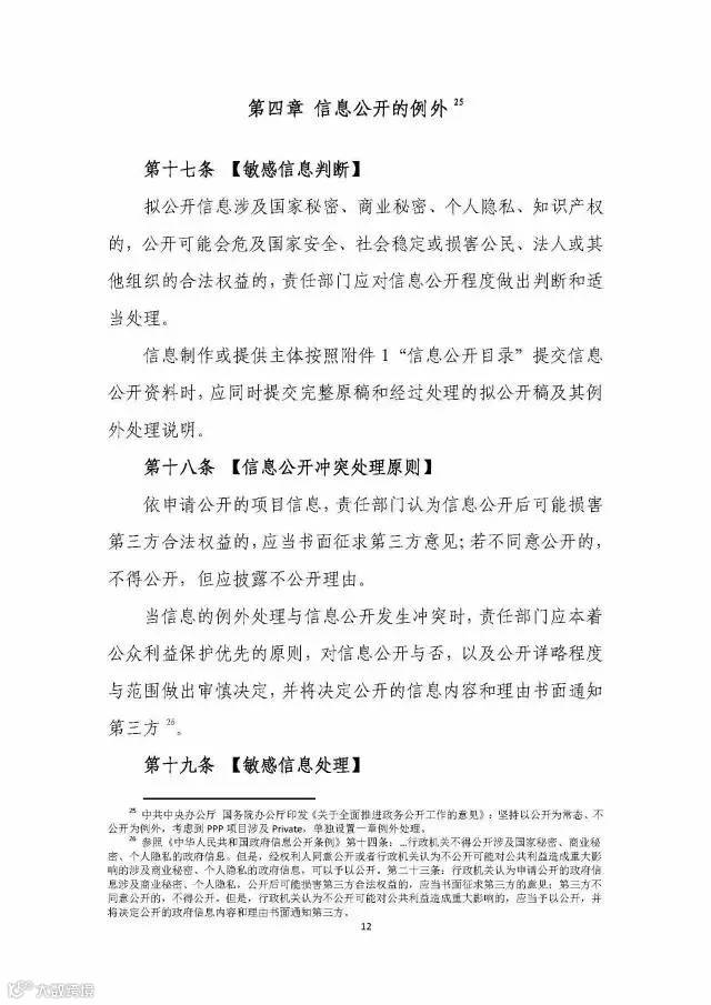 广东慧财为规范PPP项目信息公开工作,有效监督和约束PPP项目各参与方行为,保障公众知情权,促进PPP市场公平、竞争、规范、可持续发展,财政部PPP中心暨微信公众号“道PPP”刚刚发布了《政府和社会资本合作项目信息公开暂行管理办法(征求意见稿)》,以下为《暂行管理办法》全文。