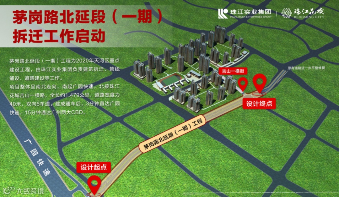 如今,在第三中轴线上,珠江实业不仅打造了总建筑面积85万平方米的红盘珠江花城,更为方便该小区业主及周边居民的出行,主动投资10亿元建设茅岗路北延段工程。