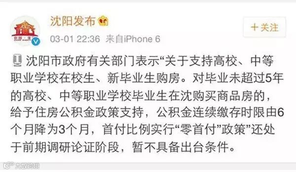 不过,该《意见》一经公布便引发热议。3月1日晚,中共沈阳市委宣布官方微博@沈阳发布称,沈阳房地产新政中的“零首付”政策还处于前期调研论证阶段,暂不具备出台条件。