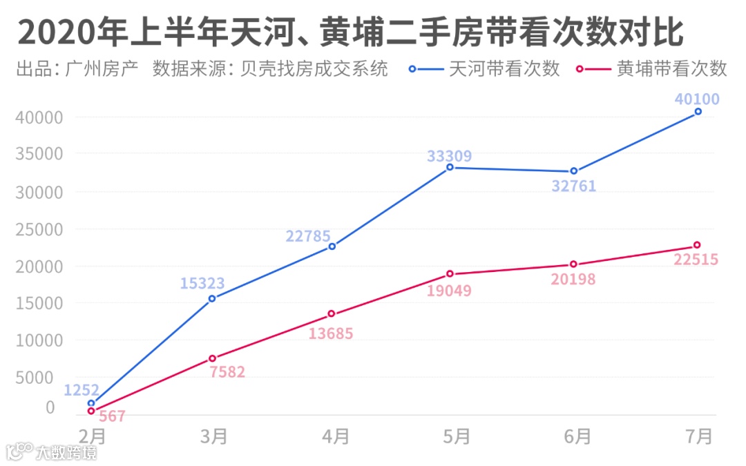 贝壳网显示,7月,天河二手房带看次数为40100次,比6月份大增7339次,相当于每天发生1336次看房。同期,黄埔二手看房次数为22155,与天河的差距一目了然。