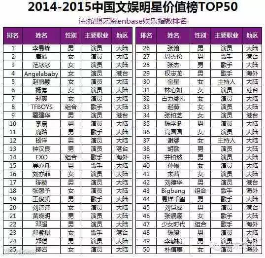 在艺恩26日公布的“2014-2015年度中国文娱明星价值榜50强榜单”中,AngelaBaby排第4位,李晨排第10位,陈赫为17位,郑凯为24位。