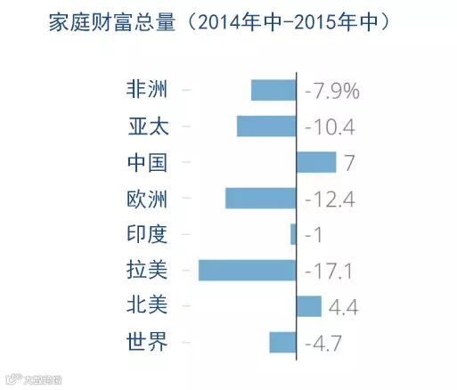 全球的家庭净资产都在减少,降幅为4.7%,只有中国和北美除外,这两个地方的财富分别增长7%和4.4%。