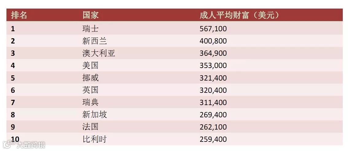 瑞士人均财富比2014年下降了4.2%,但仍然高达567,100美元,成为全世界最富裕的国家,也是唯一一个人均财富超过50万美元的国家。