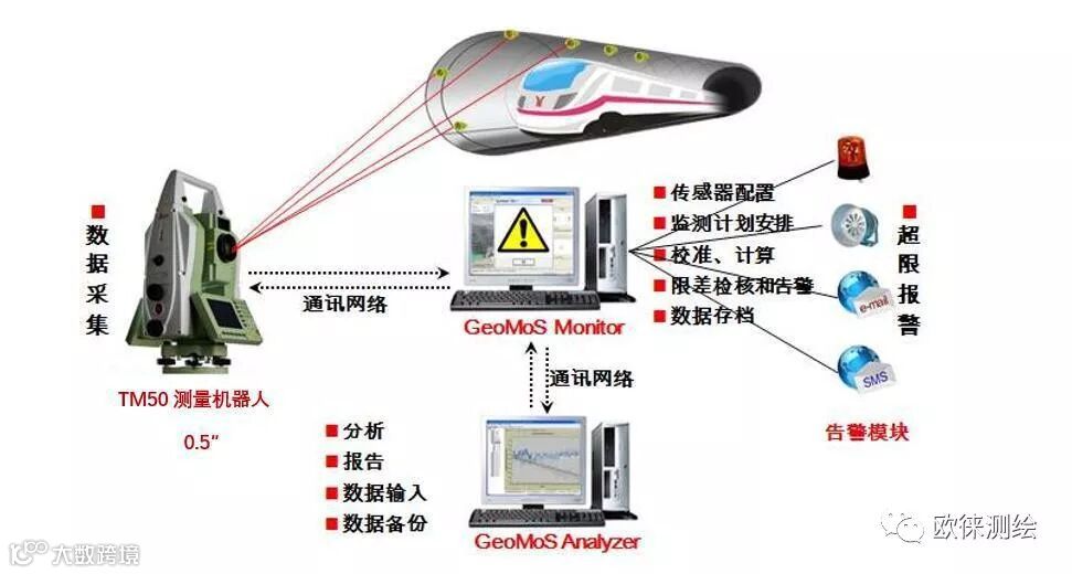 徕卡地铁自动化监测系统可以实现 24 小时全自动监测,具有精度高、效率高、全自动等优势。同时徕卡地铁自动化监测系统拥有世界上最优的小视场技术,在棱镜安装密集区域,也可以精确照准棱镜,以获取真实准确的监测数据。更少的机器人可以监测更多的棱镜,在保证数据精度的前提下,为客户减少设备成本的投入。