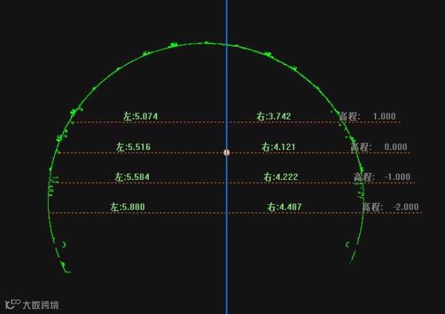 隧道断面根据设定的里程位置在点云中自动切割出来,并计算出各个不同高度位置的净空值,断面图形和净空值同时显示,是否超限一目了然