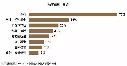 七成超高净值人群有融资需求。融资目的中,65%为企业扩张;27%为企业并购;8%为经营周转。银行是他们最重要的融资渠道,占77%。