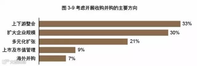 3/4未来有计划开展收购并购,主要方向依次为上下游整合、扩大企业规模、多元化扩张,分别占33%、30%和21%。