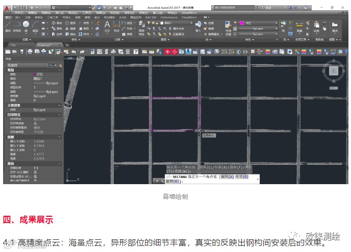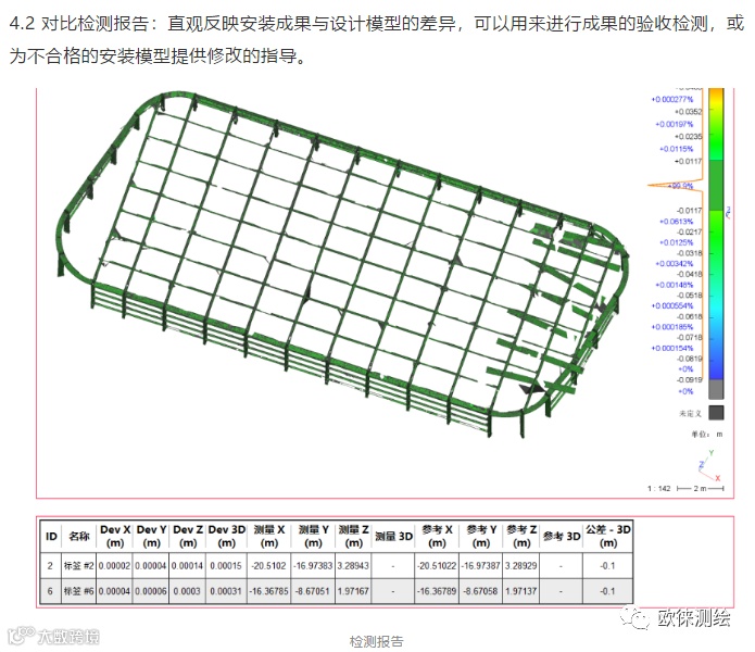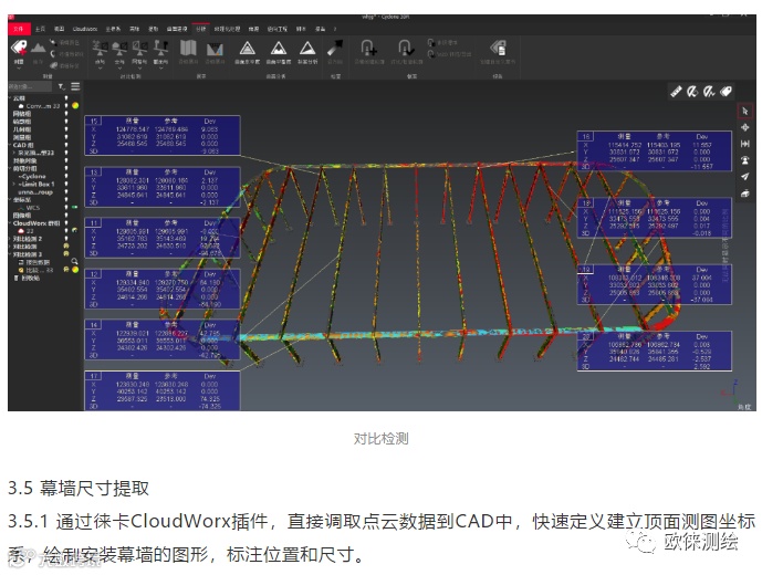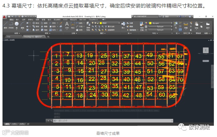 检测报告非常直观,能够有效检测安装是否合格,以及不合格的差异值,为后续的修改提供指导。 玻璃幕墙尺寸和位置的一一对应,为玻璃幕墙的预生产提供指导,避免了玻璃幕墙到达现场安装后再裁剪的麻烦。可以定制玻璃幕墙耗材,避免浪费,节约成本。