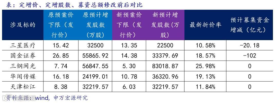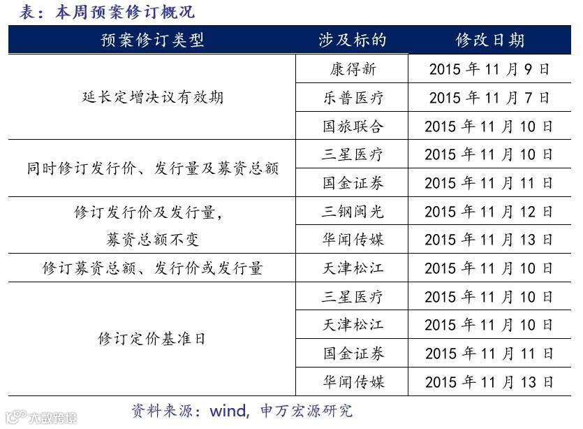 6、修改定增数较上周基本持平,停止定增数环比减少。本周累计有8宗定增项目修改了定增方案,相比上周减少1宗,其中5宗为一年期项目,3宗为三年期项目;同时本周有2宗定增项目停止了实施,相比上周减少3宗。