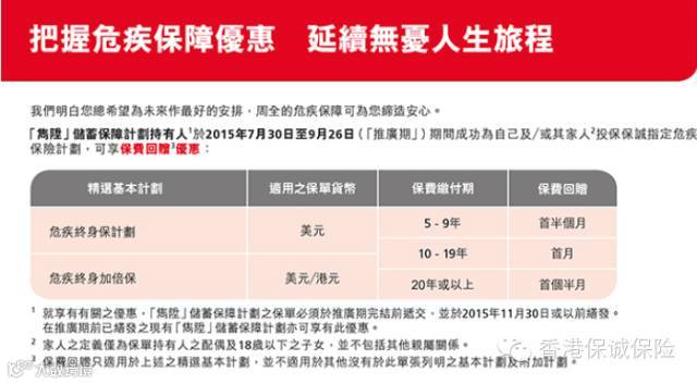 投保危疾终身加倍保计划(美元和港元保单),选择20年或以上缴费期,则可以享有首一个半月保费回赠优惠。