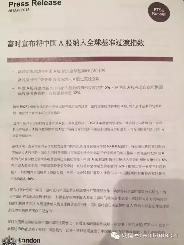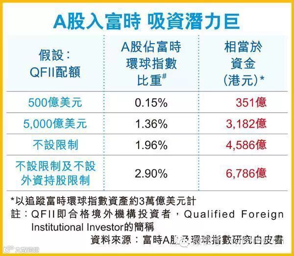 去年富时就发布一份把A股纳入其环球指数的研究白皮书。其中假设合格境外机构投资者 (Qualified Foreign Institutional Investor,简称QFII)配额增至500亿美元的话,就会有1,425只A股股票可被纳入富时环球(大中小型股)指数,令中资股于该指数占比由 2.02%增至2.17%。以市场估计追踪该指数资产约3万亿美元计,涉资就约350亿港元。根据国家外汇管理局公布的数据,截至2014年12月30日,外汇局累计审批QFII额度增至669.23亿美元,获批机构增至261家;累计审批RQFII额度为2997亿元人民币。