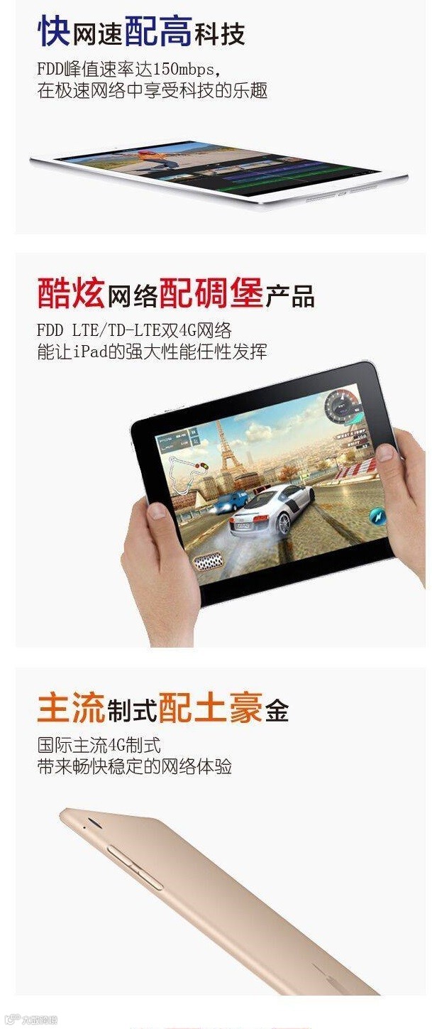 作为全新一代Ipad,土豪金机身,更轻更薄,支持FDD LTE/TDD LTE 网络,身价不菲,又岂能将就于wifi这种烂大街的流氓?