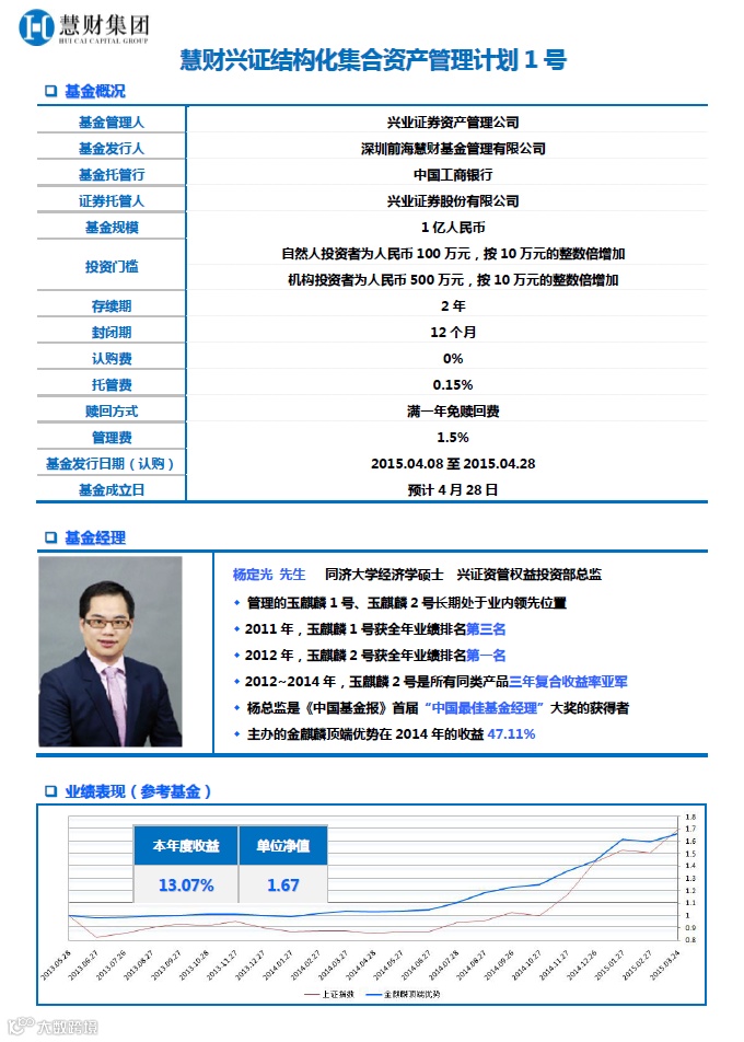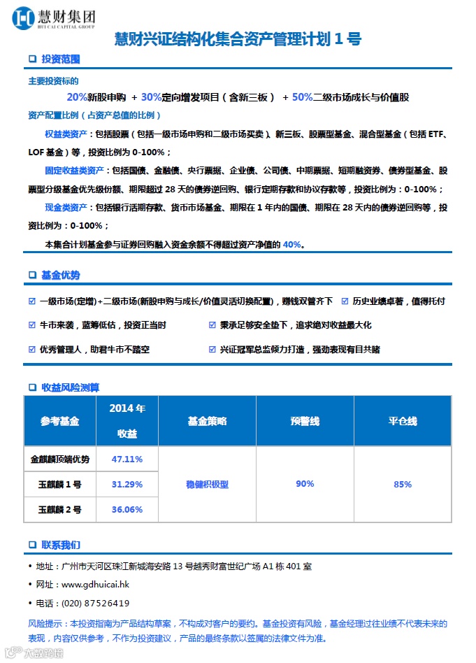 慧财兴证1号是稳健积极型集合资产管理计划产品,全称“慧财兴证结构化集合资产管理计划1号”,将一级市场和二级市场进行完美结合,融合新股申购、定向增发、新三板及二级市场成长与价值股转换的操作策略,在严控风险保证安全的基础上为投资者提供稳健收益。