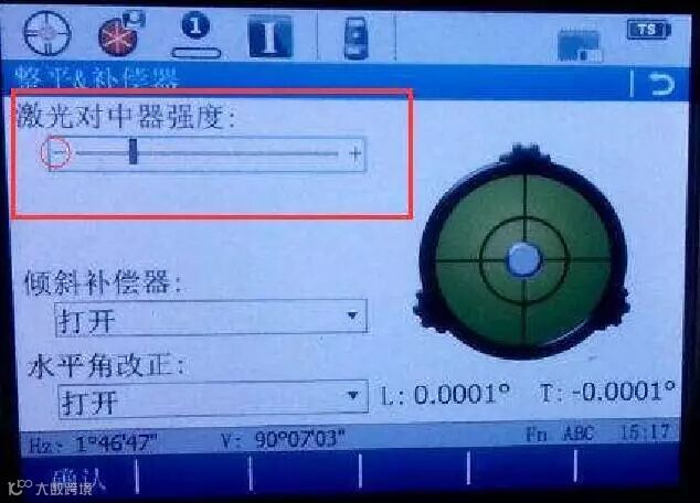 A:首先,在仪器整平的情况下,在“整平&补偿器”页面(如图 4 所示),找到“激光对中器强度”,点击“-”,