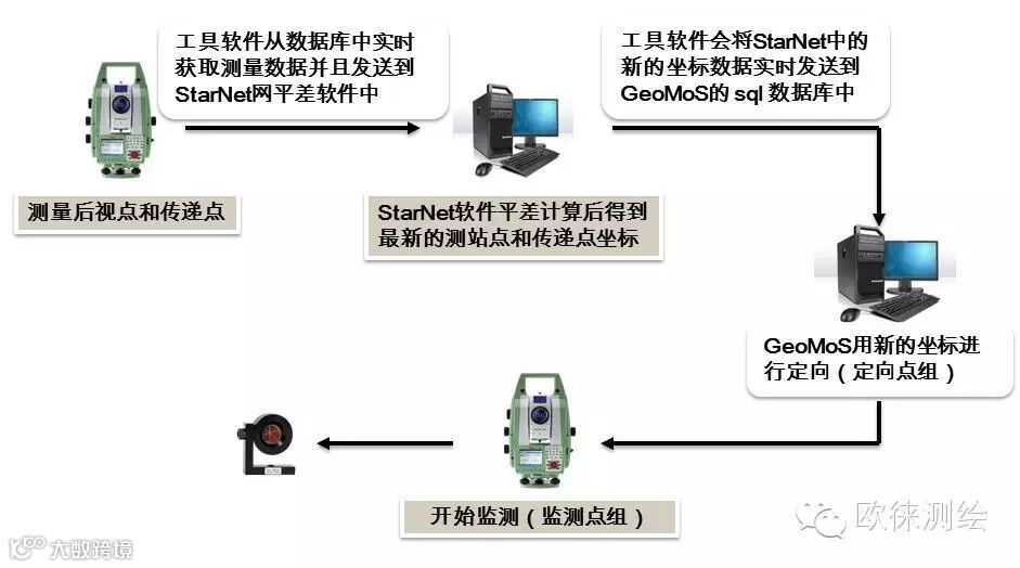 项目实施采用无人值守的全站仪自动化变形监测系统,主要由4部分组成:徕卡精密监测机器人4台,基准控制点和变形监测点棱镜若干,室内服务器包括徕卡GeoMos监测软件和MicrosurveyStarNet平差软件与上海自动平差模块,无线通讯系统。