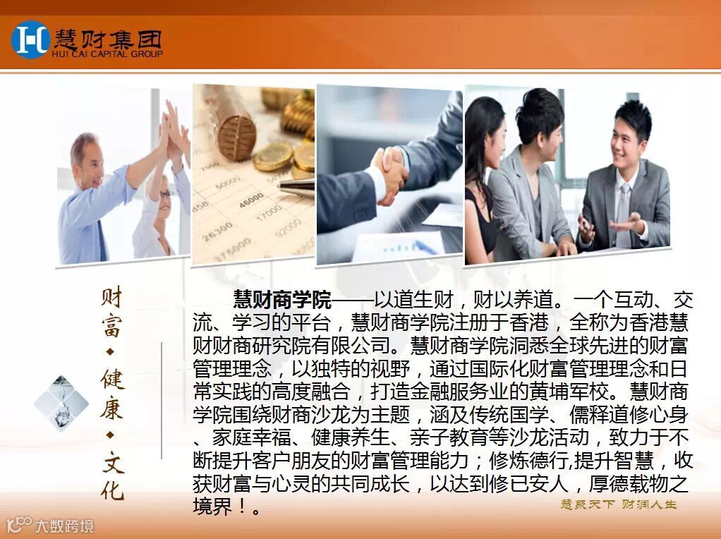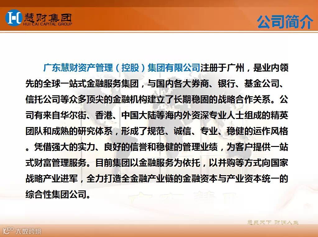 慧财集团遵循国家战略导向,是集战略咨询、产业基金、上市并购、产业投融资等为一体的金融服务集团。旨在实现金融和产业的有机结合,以多元化的金融服务,支持产业升级和战略新兴产业发展。