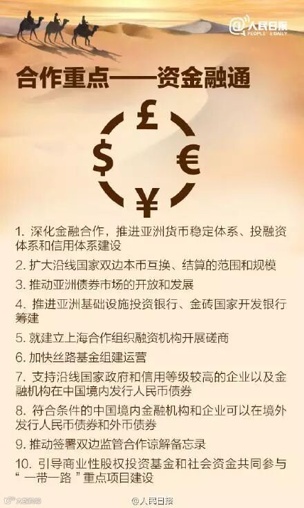 - 资金融通。支持沿线国家政府和信用等级较高的企业以及金融机构在中国境内发行人民币债券。符合条件的中国境内金融机构和企业可以在境外发行人民币债券和外币债券。引导商业性股权投资基金和社会资金共同参与“一带一路”重点项目建设。