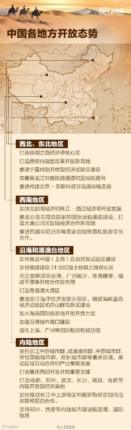 - 西南地区:加快北部湾经济区和珠江-西江经济带开放发展;打造大湄公河次区域经济合作新高地;推进西藏与尼泊尔等国家边境贸易和旅游文化合作。