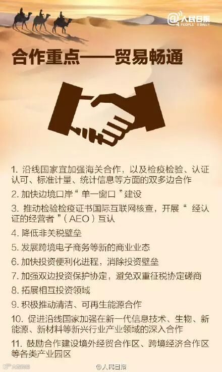 - 贸易畅通。将加快投资便利化进程,消除投资壁垒,拓展相互投资领域。积极推动水电、核电、风电、太阳能等清洁、可再生能源合作;促进沿线国家加强在新一代信息技术、生物、新能源、新材料等新兴产业领域的深入合作;鼓励合作建设境外经贸合作区、跨境经济合作区等各类产业园区等。