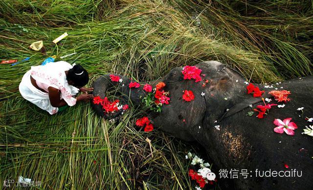 20.在印度,一头大象被火车撞伤致死,一个小女孩为它举行了花瓣葬礼