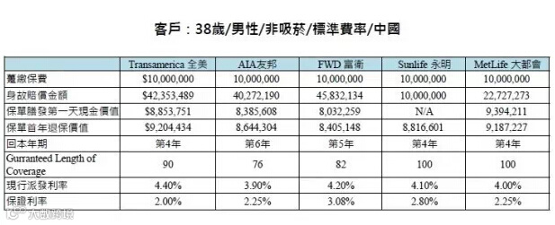 其次,就是友X人寿,举例,38岁中国籍的非吸烟男性,按照标准费率计算,趸交1000万美元的保费,人寿的身故赔偿保额金额达到4027万,现行派发利率为3.9%,退保价值为864万,达到缴费金额