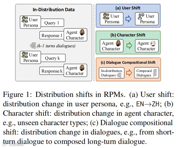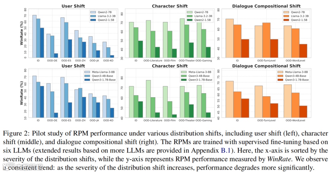 直观展示了模型在面对用户(User)、角色(Character)和对话(Dialogue)三种不同维度的偏移时,性能是如何产生“裂痕”的。