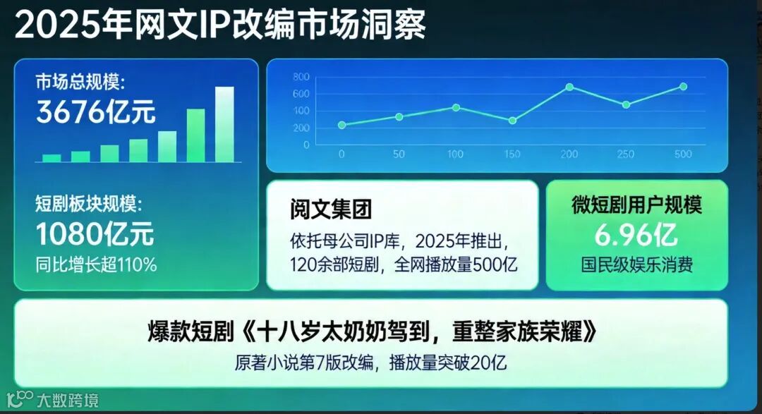 先来说说这块的市场规模,2025年,网文IP改编市场规模已达3676亿元,其中短剧板块狂飙至1080亿元,同比增长超110%。