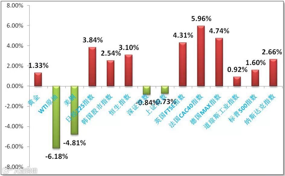 市场走势:欧美日韩股市大涨,A股下跌,黄金大涨,铜、石油大跌。