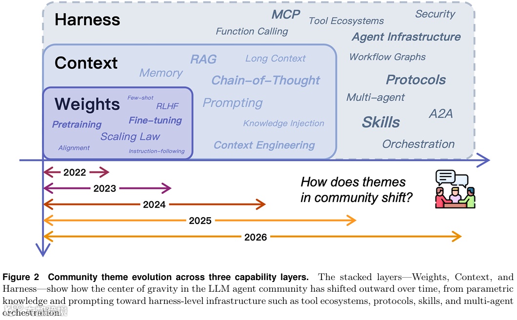 认知科学家Donald A. Norman提出的认知制品理论指出:工具外化改变了任务本质而非生理结构。大语言模型智能体正经历类似历程,能力从权重参数外移至记忆、技能与协议系统。