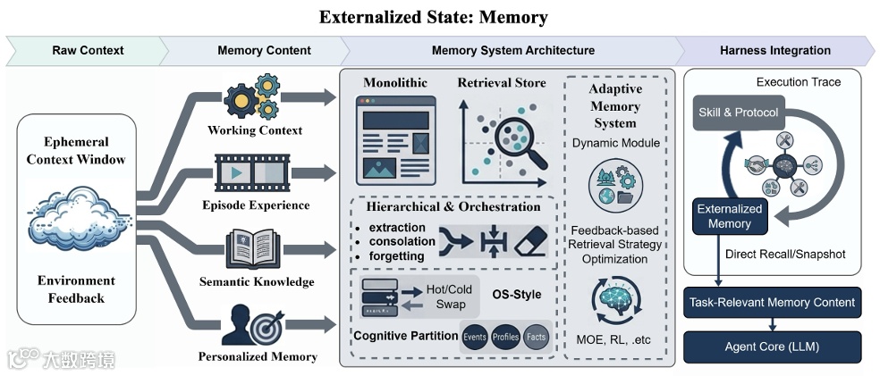 智能体技术演进呈现清晰路径:早期能力全在参数中,存在更新困难;随后转向提示词设计,但会话状态无法留存;当前重点已转至持久化基础设施,其可靠性取决于外部记忆库、工具注册表及运行环境治理。