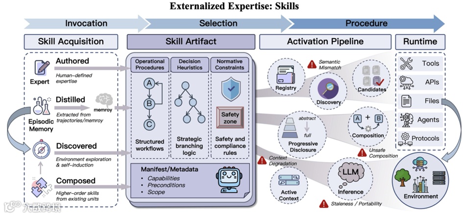技能系统保障执行稳定性,由操作程序、决策规则与规范约束构成。完整调度链包含:注册检索、渐进式披露、执行绑定及技能组合生成。优秀系统能从交互轨迹中自动蒸馏新技能。