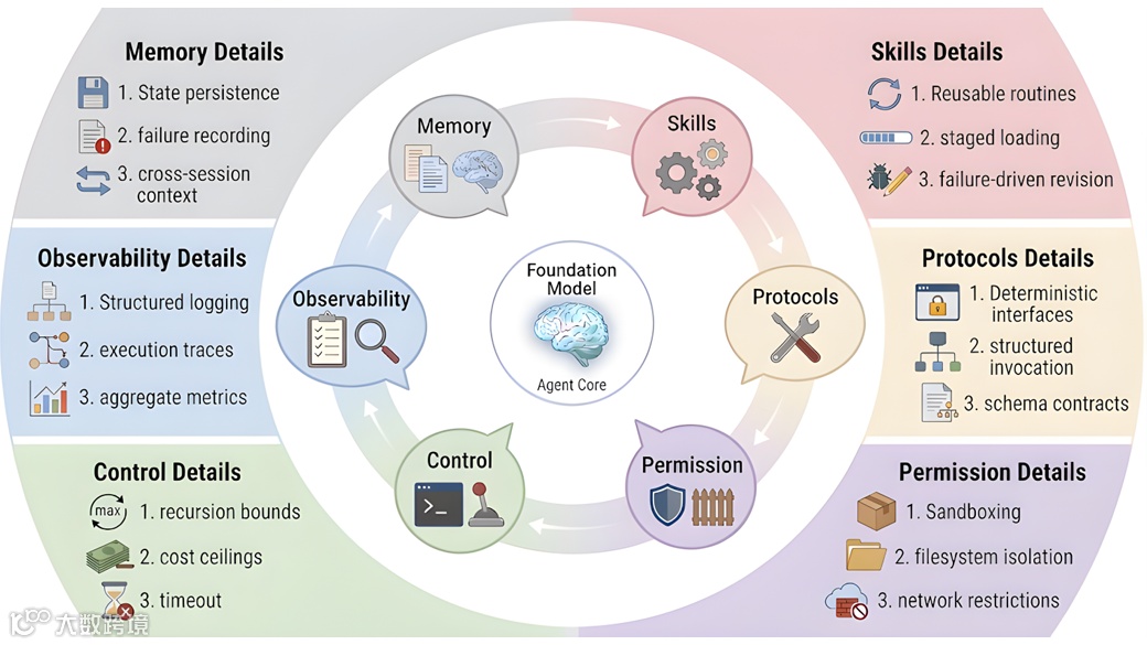 Harness作为架构核心基座,通过沙盒隔离、可观测性与子智能体编排等机制,将记忆、技能和协议有机整合为可治理系统。